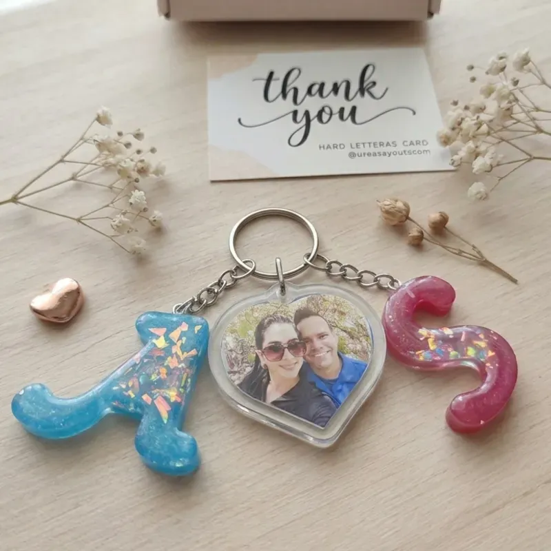 Corazón de acrílico con dos fotos mas dos letras personalizadas
