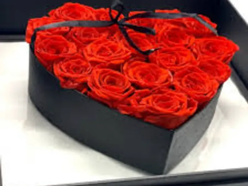 Cajita con forma de corazón, incluye 2 rosas y 10 bombones +decoración del color que desee