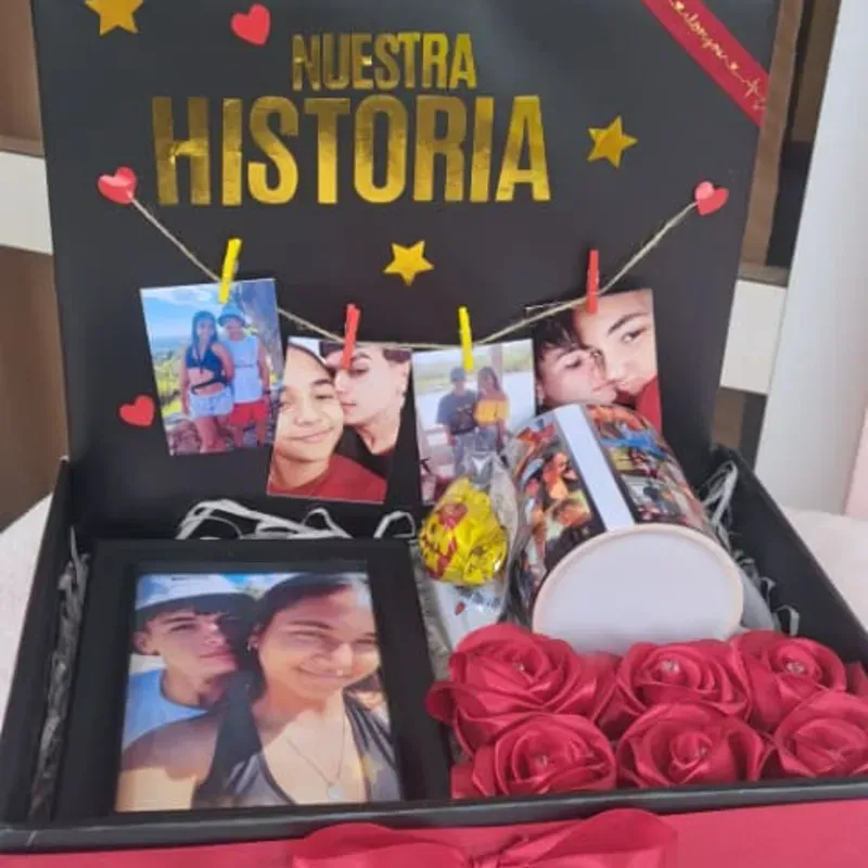 Caja con jarra, cuadro, rosas y fotos