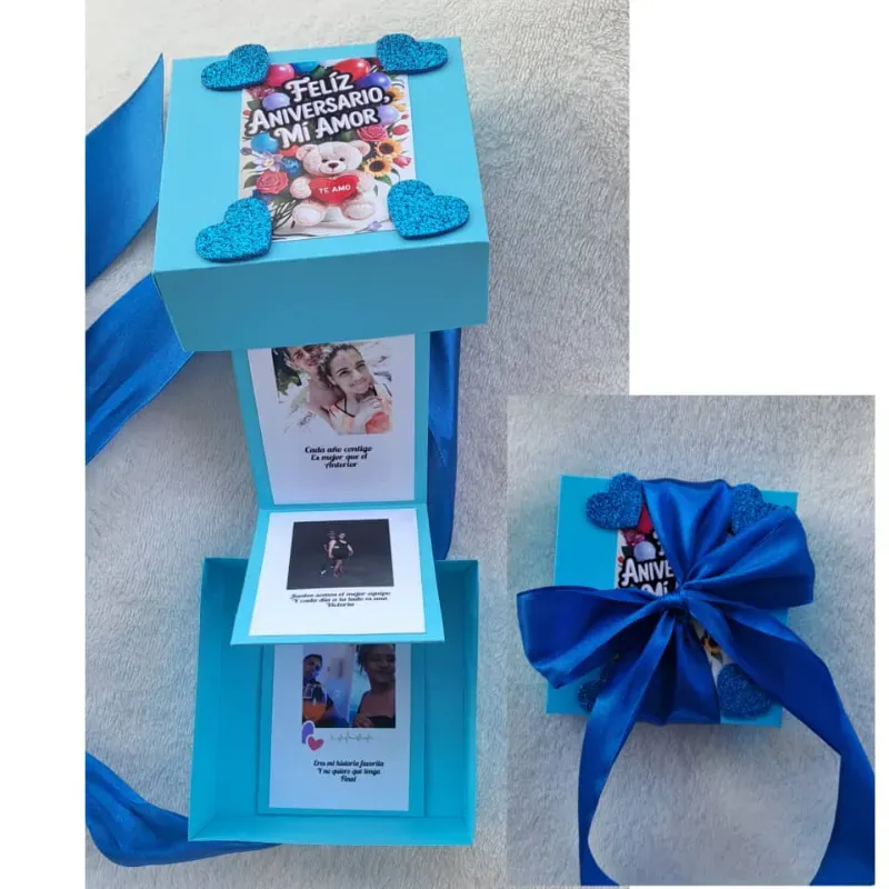 Cajita azul con 6 fotos. Una de ellas es la portada