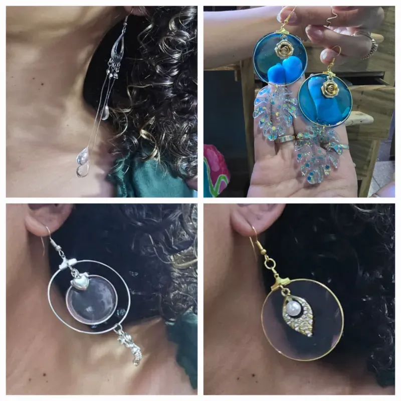 Aretes de diferentes diseños confeccionados con resina epóxica.