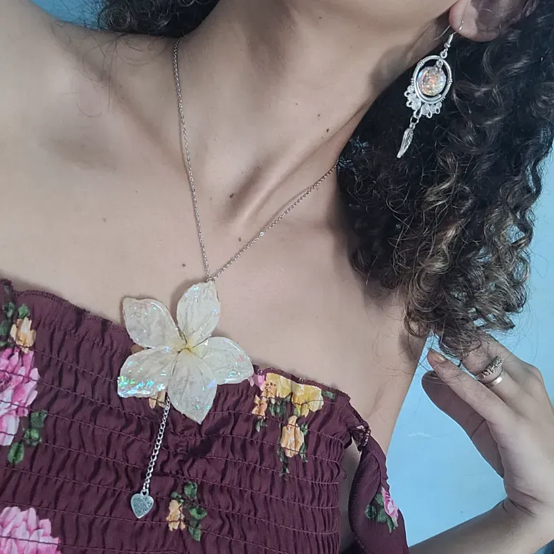 Juego plateado de acero inoxidable con flor conservada en resina y cristales. Compuesto por un collar y un par de aretes.