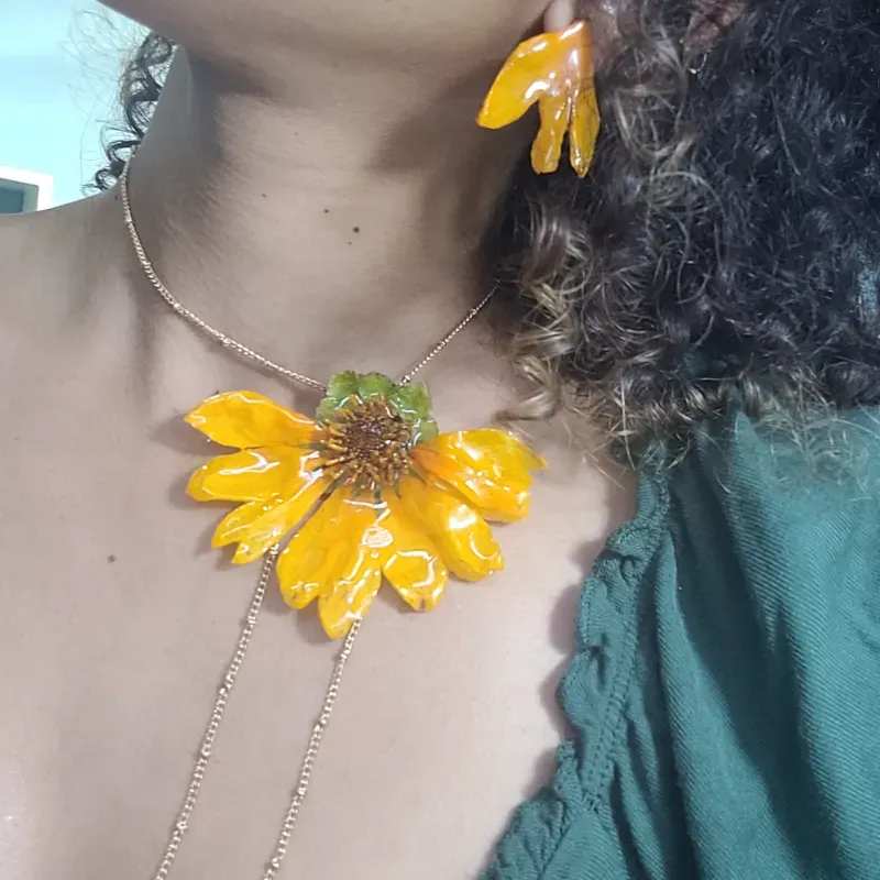 Collar de acero inoxidable con girasoles naturales conservados en resina y aretes de pétalos de girasol.