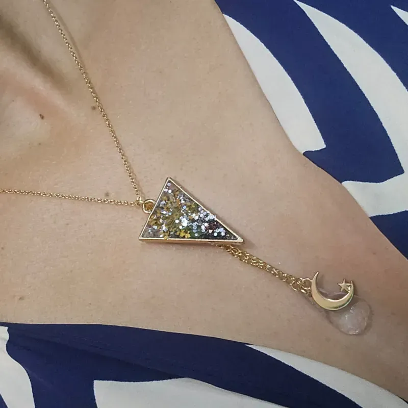 Collar de cadena simple con triángulo de resina y colgante con dije y cristales.