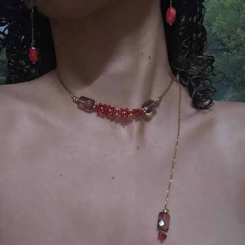Gargantilla dorada de acero inoxidable con accesorios de color rojo y un par de aretes a juego.