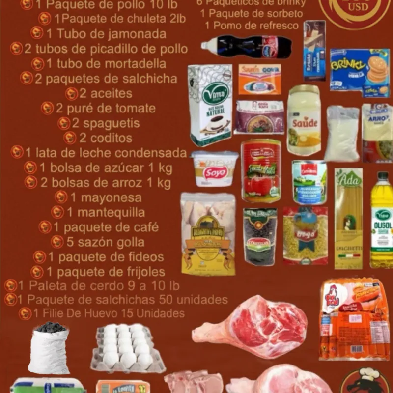 1 Pernil de cerdo de9 a 10 1 Paquete de pollo 10 lb 6 Paqueticos de brinky 1 Paquete de chuleta 2lb 1 Paquete de sorbeto 1 Pomo de refresco 1 Tubo de jamonada 2 tubos de picadillo de pollo 1 tubo de mortadella 2 paquetes de salchicha 2 aceites 2 purĂ© de tomate 2 spaguetis 2 coditos 1 lata de leche condensada 1 bolsa de azĂșcar 1 kg 2 bolsas de arroz 1 kg 1 mayonesa 1 mantequilla 1 paquete de cafĂ© 5 sazĂłn golla 1 paquete de fideos 1 paquete de frijoles 1 Paleta de cerdo 9 a 10 lb 1 Paquete de salchichas 50 unidades