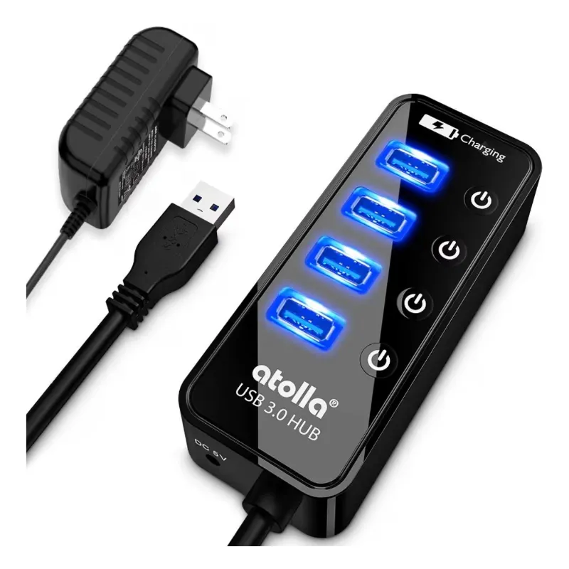 Atolla Hub USB 3.0 de 4 puertos con 4 puertos de datos, 1 puerto de carga inteligente, interruptores individuales de encendido/apagado y adaptador de 5 V/3 A