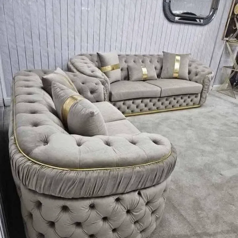 Este es un juego de sala de estilo glamuroso y contemporáneo, diseñado para ser el centro de atención de cualquier espacio. Se destaca por su diseño robusto, detalles metálicos y una textura capitoné muy marcada.