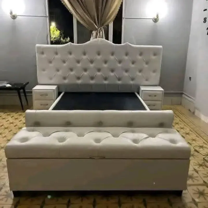 Este juego de cuarto presenta un estilo clásico-contemporáneo con un enfoque en el lujo y la comodidad. El diseño destaca por su tapicería detallada y su apariencia monocromática en un tono crema o blanco marfil.