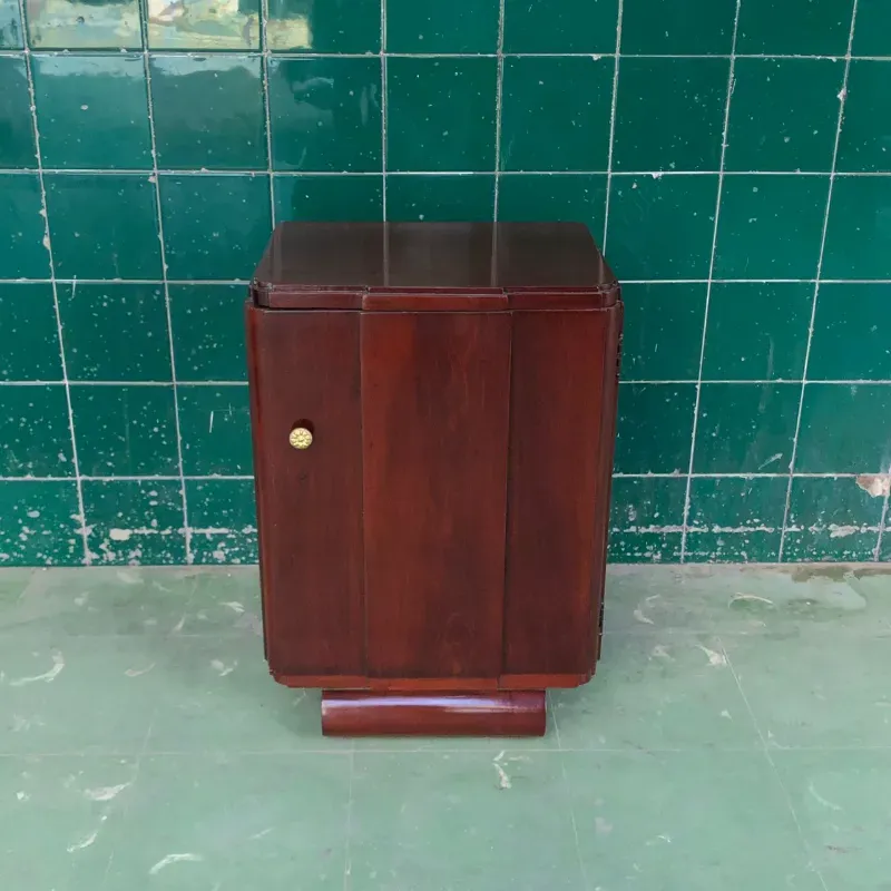Mesita de noche sola antigua acabada de restaurar. En el interior cuenta con un entrepaño.