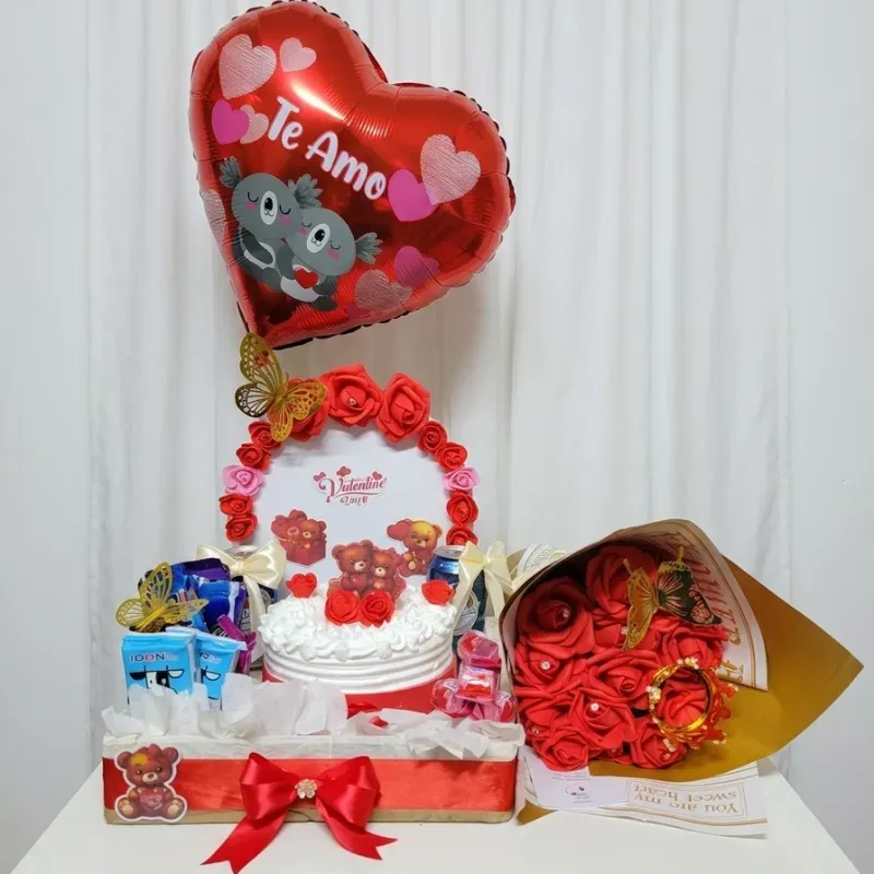 Bandeja de desayuno que incluye mini cake y variadas confituras, decorada con globos y cinta, acompañada de un hermoso ramos de 15 rosas esternas.
