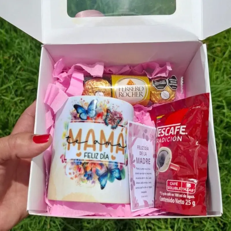 Caja sorpresa con una taza personalizada, más confituras.