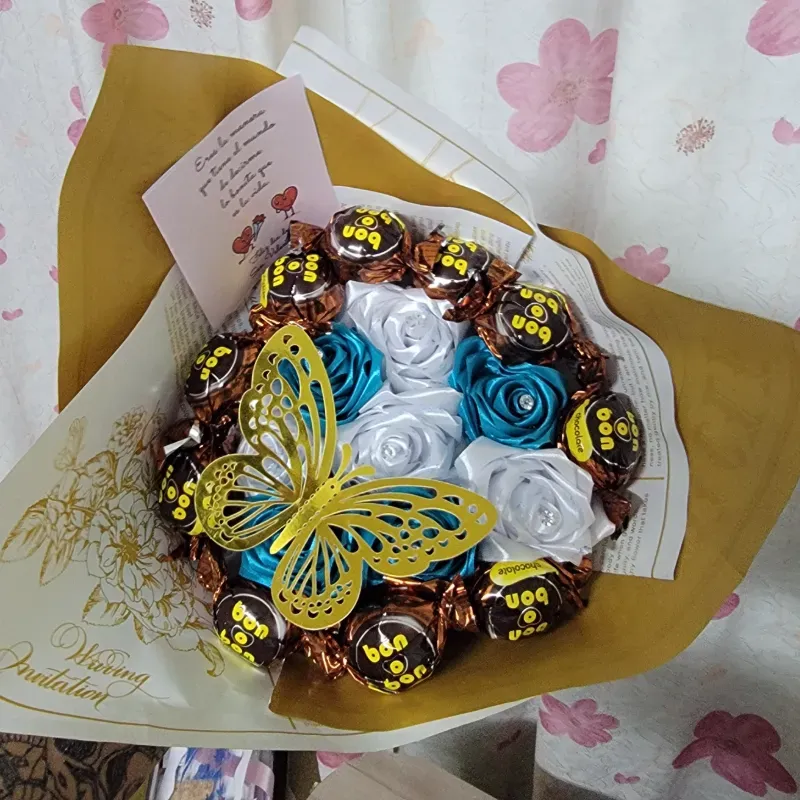Ramos de 8 rosas más bombones, decorado con cintas y mariposas.