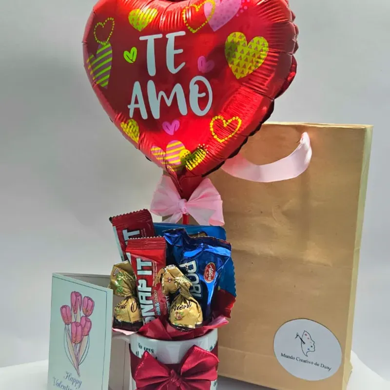 Taza personalizada con confituras variadas dentro y decorada con globo y cinta. Plus: Juego de pulseras Nota: A todos los los regalos se le pueden agregar peluches.