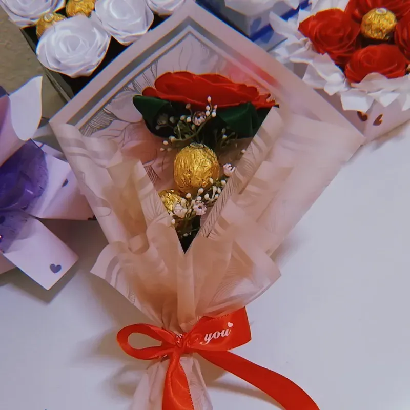 Clásico arreglo de la rosa solitaria, esta vez acompañada de dos ferreros... Una combinación romántica y perfecta para sorprender con un detalle sencillo y elegante.