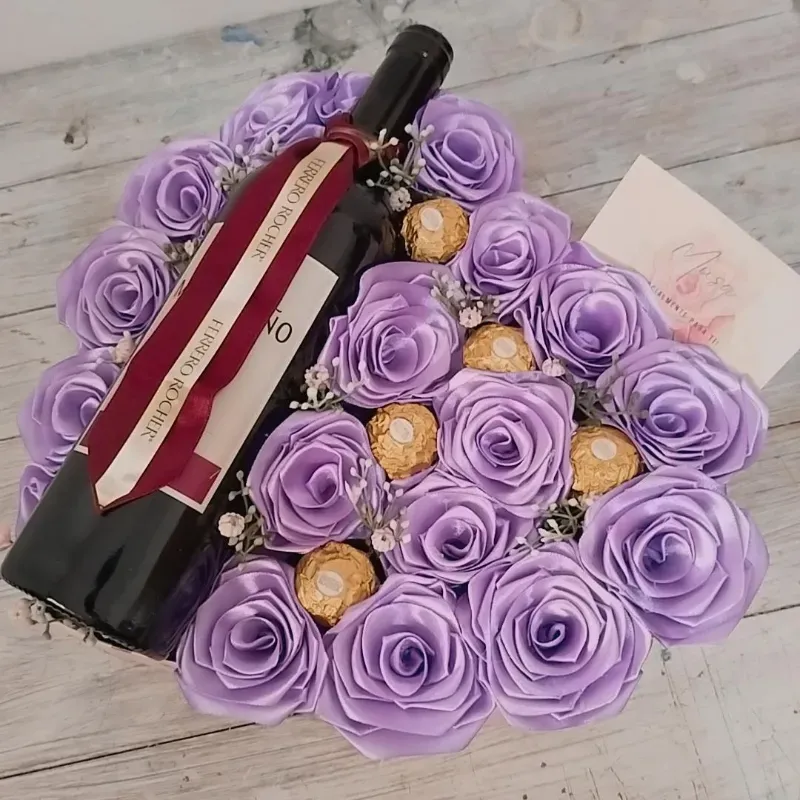 Elegante regalo presentado en una caja grande en forma de corazón, compuesto por 17 rosas, 5 ferreros y una botella de vino.