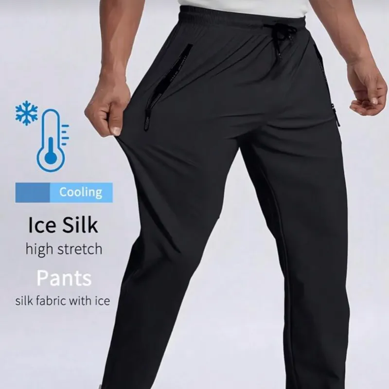 Pantalones ligeros y transpirables de running elásticos para hombre, con bolsillos con cremallera y cintura con cordón, tela de seda de hielo suave y cómoda.