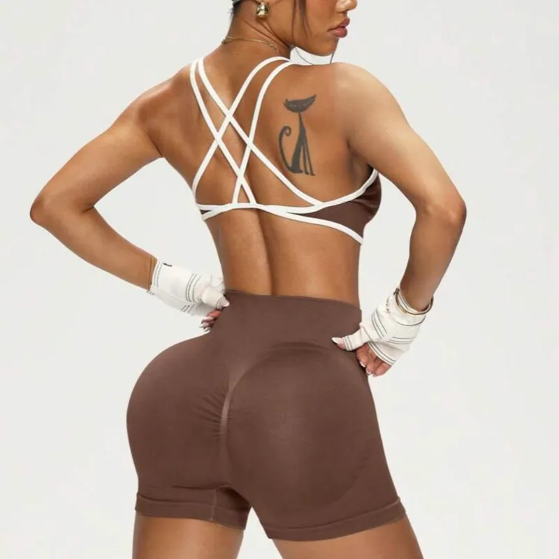 Conjunto de yoga y fitness sin costuras y elásticos, sensual. Sujetador deportivo y pantalones cortos para mujer