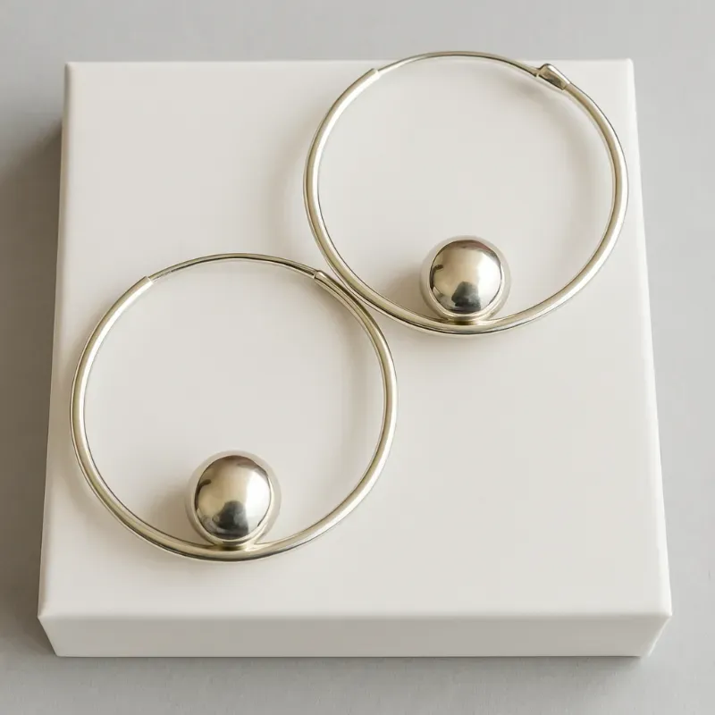 Argollas gruesas con adorno de bola de plata. 4 cm de diámetro