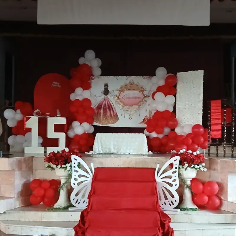 👉Recepción de entrada ✔️Arco decorativo con telas ✔️Caballete ✔️Cartel "Bienvenidos a mi quince" 👉Montaje del set principal ✔️Fondo (4 estructuras con baner o telas decorativas) ✔️Mesitas para dulces (3 Cilindros y #15 en madera) ✔️Adornos acorde al diseño y montaje ✔️Útiles (bases para cupcakes, bandeja) ✔️250 Globos. ✔️# 15 inflable de 32 in ✔️Montaje de mesa doble familiar Servicios incluidos: 👉60 invitaciones 👉Maquillaje y peinado 👉Fotógrafo (Fotos DIGITALES+amp) 👉Camarógrafo 👉Repostería ✔️Cake de UN piso ✔️15 cupcakes ✔️15 Cake pops 👉Transportación