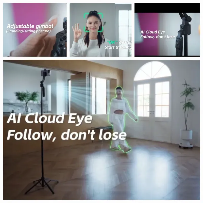 Gracias a su rotación automática de 360° y seguimiento facial por inteligencia artificial (AI), el trípode sigue tus movimientos en tiempo real, manteniéndote siempre enfocado en el centro de la imagen.