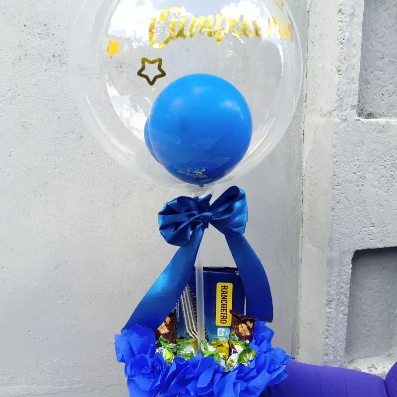 Caja de regalo con globos burbuja. Con 10 confituras, globo burbuja y decoración de cajas. Color que el cliente desee. El precio puede variar en dependencia de lo que el cliente desee dentro de la caja, se le puede incluir bebidas, peluche.