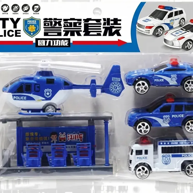 Este juguete es un set de vehículos de policía "City Police" diseñado para niños mayores de 3 años. Se trata de una colección de juguetes con mecanismo de fricción (pull-back) que incluye varios elementos de emergencia y rescate para el juego imaginativo.