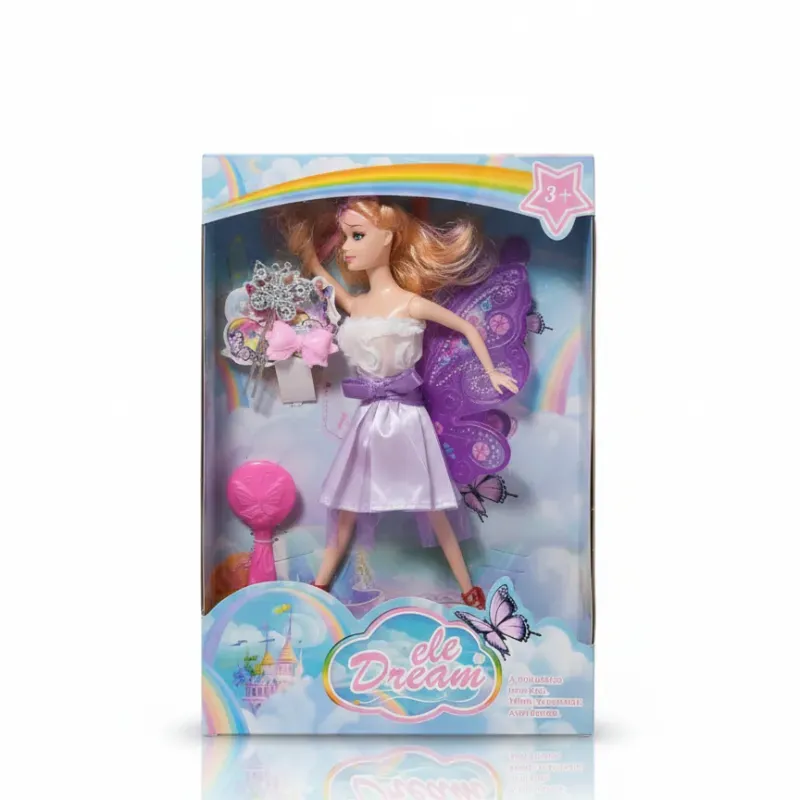 ¡Haz realidad los sueños de cuento de hadas con la muñeca Ele Dream! Esta encantadora hada mágica está lista para llevar a los más pequeños a un universo lleno de brillo, arcoíris y aventuras fantásticas. Con sus detalladas alas de mariposa y accesorios brillantes, es la compañera perfecta para estimular la imaginación y el juego creativo. Su diseño elegante y sus accesorios personalizables la convierten en un regalo inolvidable que destaca por su encanto y delicadeza. Detalles que enamoran: Alas de Fantasía: Cuenta con espectaculares alas de mariposa en color violeta con patrones intrincados que invitan a volar con la imaginación. Accesorios de Realeza: Incluye una varita mágica plateada con detalles de corazón, un lazo rosa y un cepillo especial para cuidar su larga cabellera rubia. Atuendo Elegante: Viste un hermoso vestido satinado en tonos lila y blanco con un cinturón a juego, perfecto para cualquier celebración en el reino. Edad Recomendada: Ideal para pequeñas soñadoras a partir de los 3 años. Presentación de Regalo: Viene en una caja temática decorada con castillos y nubes que hará que la experiencia de abrirla sea mágica.