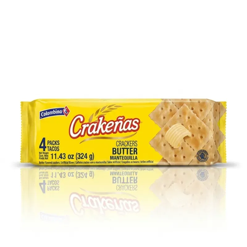 La suavidad de la mantequilla y la textura crujiente que endulzan tus pausas. Las Galletas Crakeñas de Mantequilla Colombina vienen en un práctico paquete de 4 tacos (sobres) que suman 324 g. Son galletas tipo cracker horneadas, con un delicado sabor a mantequilla y un punto justo de sal que las hace irresistibles. Perfectas para acompañar tus bebidas favoritas o para disfrutar solas en cualquier momento.