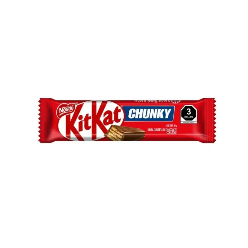 KitKat Chunky con Leche es una barrita gruesa de waffle crujiente, cubierta con suave chocolate con leche. En su formato individual de 40 g, es el snack ideal para recargar energías y disfrutar de un break delicioso en cualquier momento.