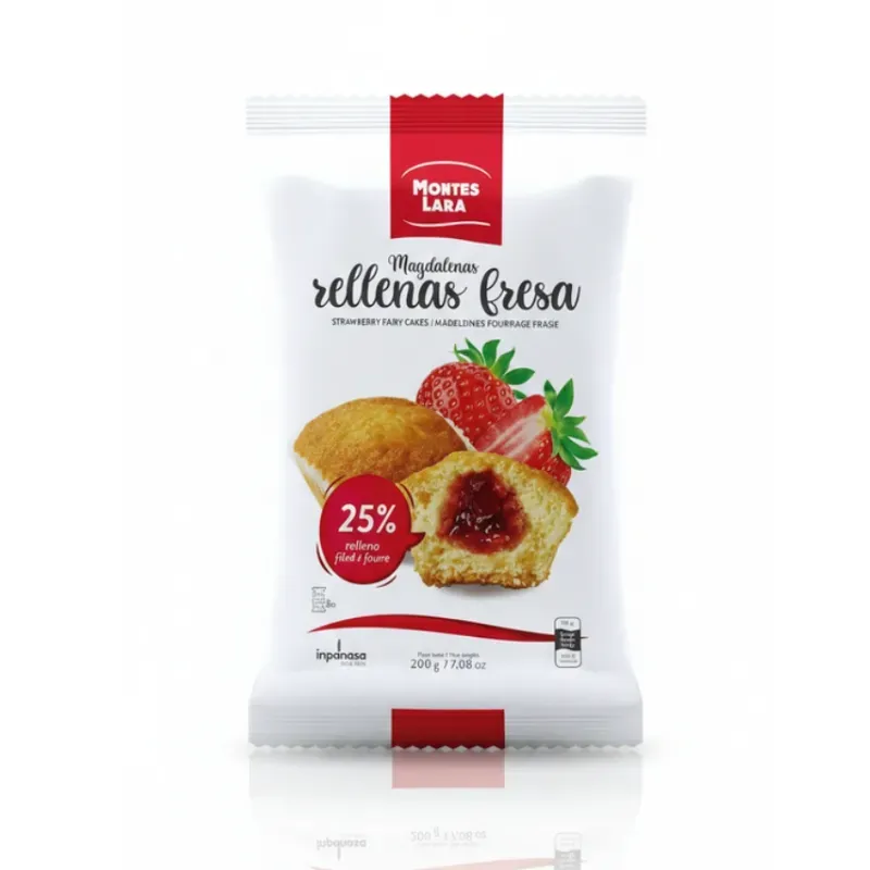 Las Magdalenas Rellenas de Fresa Montes Lara, en su práctico envase de 200g, combinan la suavidad de la masa tradicional con un delicioso corazón de crema sabor fresa. El equilibrio perfecto entre lo clásico y lo frutal.