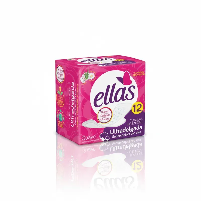 Las Toallas Higiénicas Ellas Ultradelgadas ofrecen absorción confiable y discreción total en un diseño anatómico que se adapta a tu cuerpo sin agregar volumen. Perfectas para sentirte fresca y protegida sin sacrificar comodidad. Beneficios: ✅ Protección efectiva para flujo moderado, con máxima discreción. ✅ Diseño ultradelgado y flexible – casi imperceptible, sin molestias. ✅ Superficie suave y seca que cuida tu piel y previene irritaciones. ✅ Pack de 12 unidades – ideal para uso diario o como reserva práctica. Ideal para: Días de flujo moderado, uso diario durante tu ciclo, actividades físicas o cuando buscas comodidad y discreción sin comprometer la protección. ¡Tu día fluye sin interrupciones!
