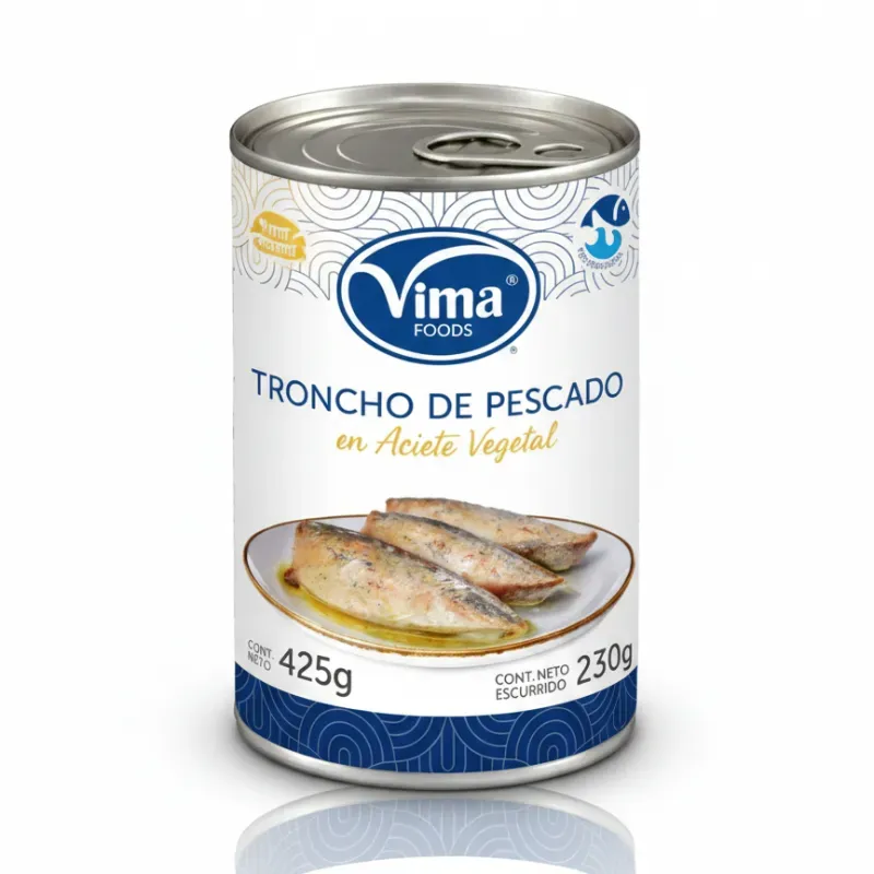 Los Tronchos de Pescado en Aceite Vegetal VIMA, en su lata de 425g (peso escurrido 230g), son trozos firmes y jugosos de pescado de alta calidad, listos para usar en tus preparaciones favoritas. Conservados en aceite vegetal, mantienen su textura y sabor, ideales para resolver comidas rápidas, nutritivas y deliciosas.