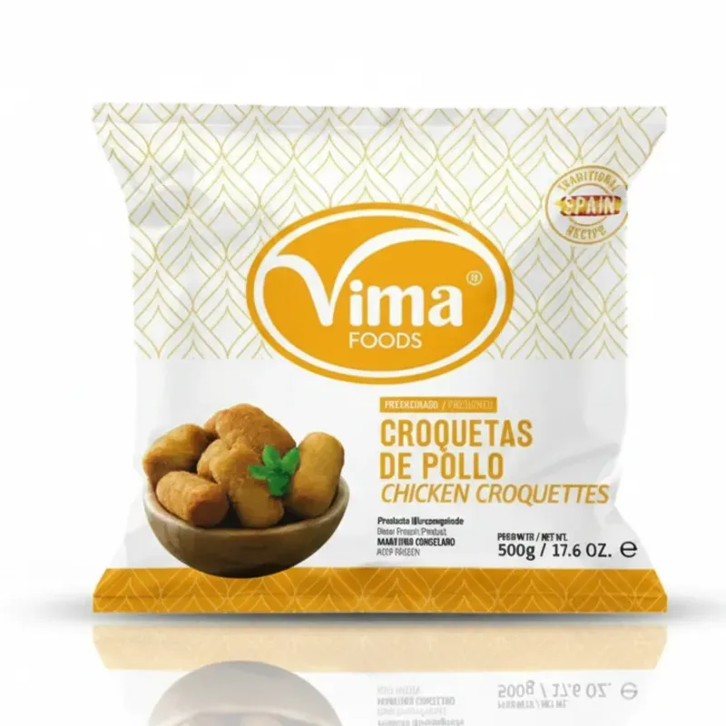 Croquetas de Pollo VIMA 500g Croquetas españolas listas en 3 minutos. Elaboradas con una receta tradicional de pollo y bechamel, son crujientes por fuera y cremosas por dentro. Fácil preparación: se fríen directamente congeladas en aceite caliente hasta dorar. El producto contiene trigo, leche y trazas de otros alérgenos.