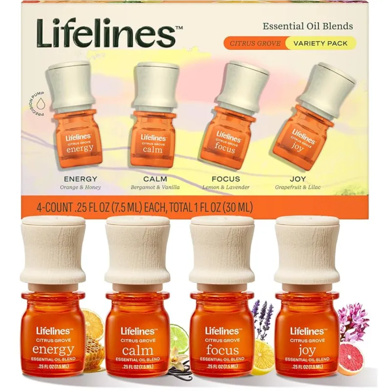 Lifelines - Mezclas de aceites esenciales mezclados con bomba de precisión para difusores de aromaterapia, paquete de 4, de larga duración, Citrus Grove (alegría, calma, concentración y energía)