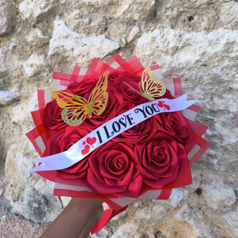 Ramo artesanal compuesto por rosas de satén en un intenso tono rojo, dispuestas en forma circular y envueltas en papel decorativo rojo con detalles blancos a cuadros. Dos mariposas doradas realzan la composición, aportando brillo y elegancia.