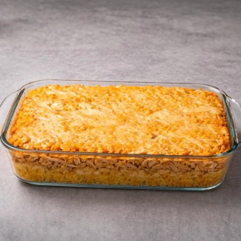 Delicioso arroz imperial con pollo, pescado y cerdo, cubierto con queso gratinado 🤤✨