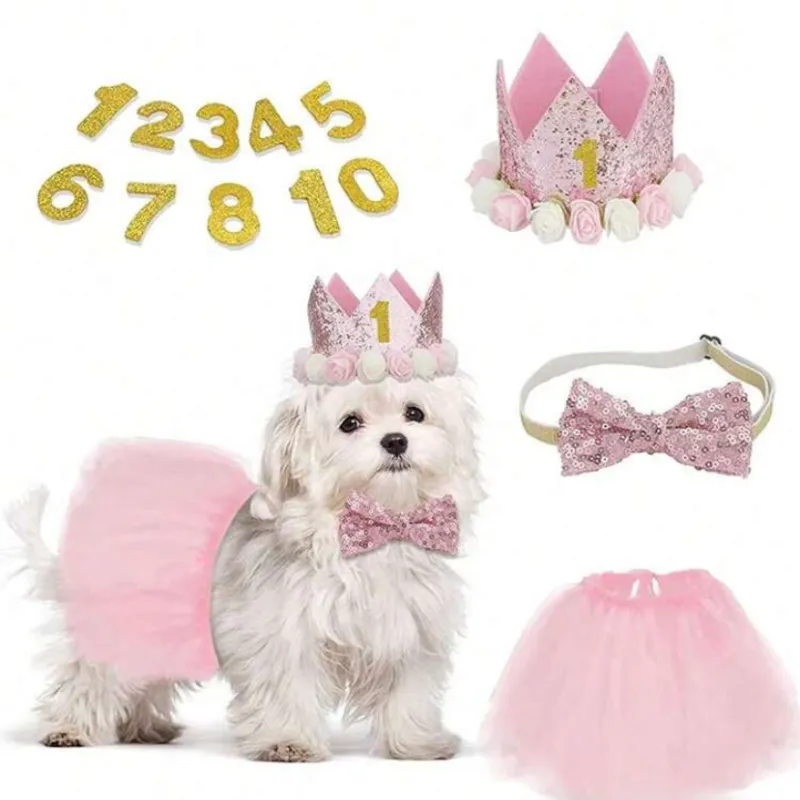 Incluye 1 gorro de cumpleaños rosa, 1 corbata de moño, 1 falda de tutú y 1 paquete de pegatinas con números del 0 al 8, adecuado para perros pequeños y medianos.