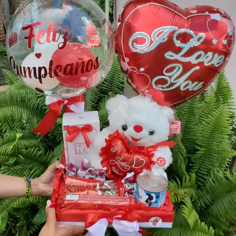 Peluche,confituras,1 leche condensada,decoración de globos personalizados y perfume