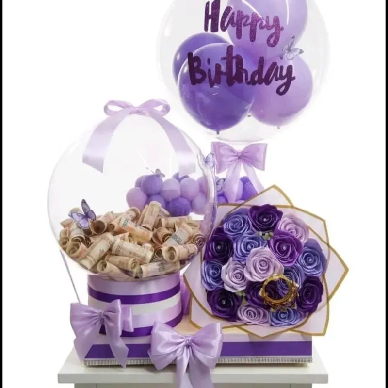 Cajita decorada con ramo de rosas eternas y globo burbuja con dinero🤩
