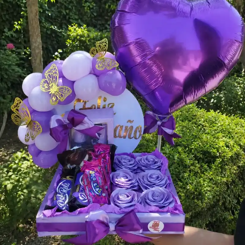 Set de colonia y crema,algunos chocolates o confituras,decoración con rosas eternas y globos