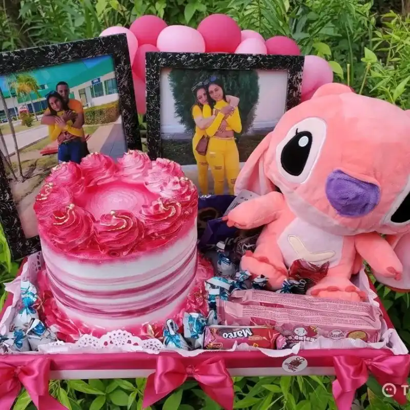Peluche(variado),pastel,algunas confituras y 2 cuadros de fotos