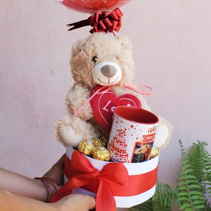 Peluche,bombones, taza personalizada y globo burbuja personalizado
