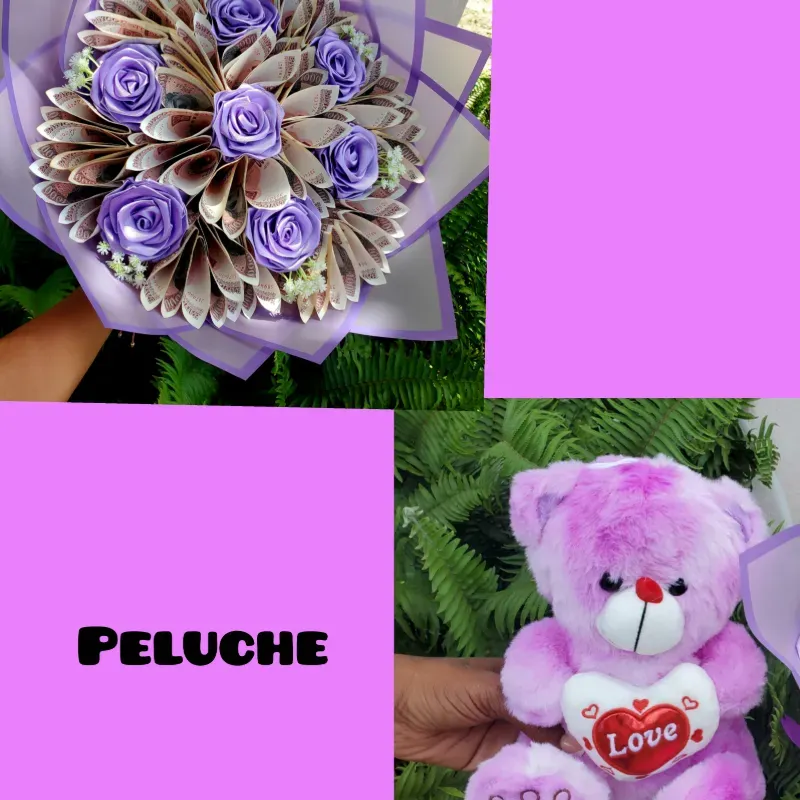 Ramo de rosas eternas con billetes y peluche osito💜