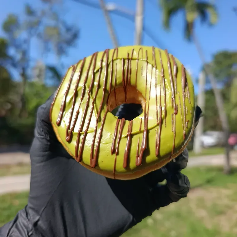 Rica dona cubierta de coberturas de pistacho con rayas de chocolate oscuro