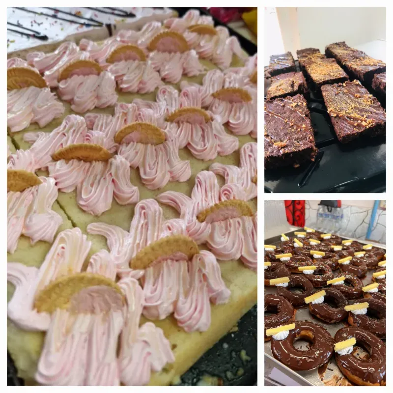 Caja con 5 brownies + 5 porciones 3 leches de vainillas + 5 donas cubiertas con cobertura de chocolate