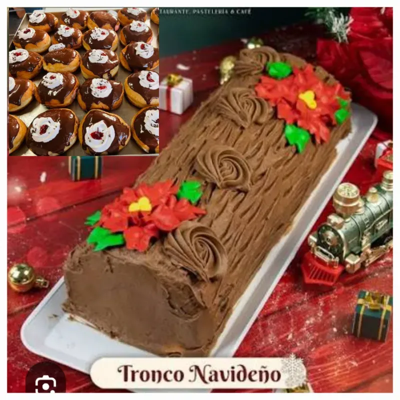 Tronco Navideño (Brazo gitano de 20 cm de largo relleno y cubierto con crema mantequilla de chocolate y maní) + 5 berlinesas rellenas de crema chiboux .