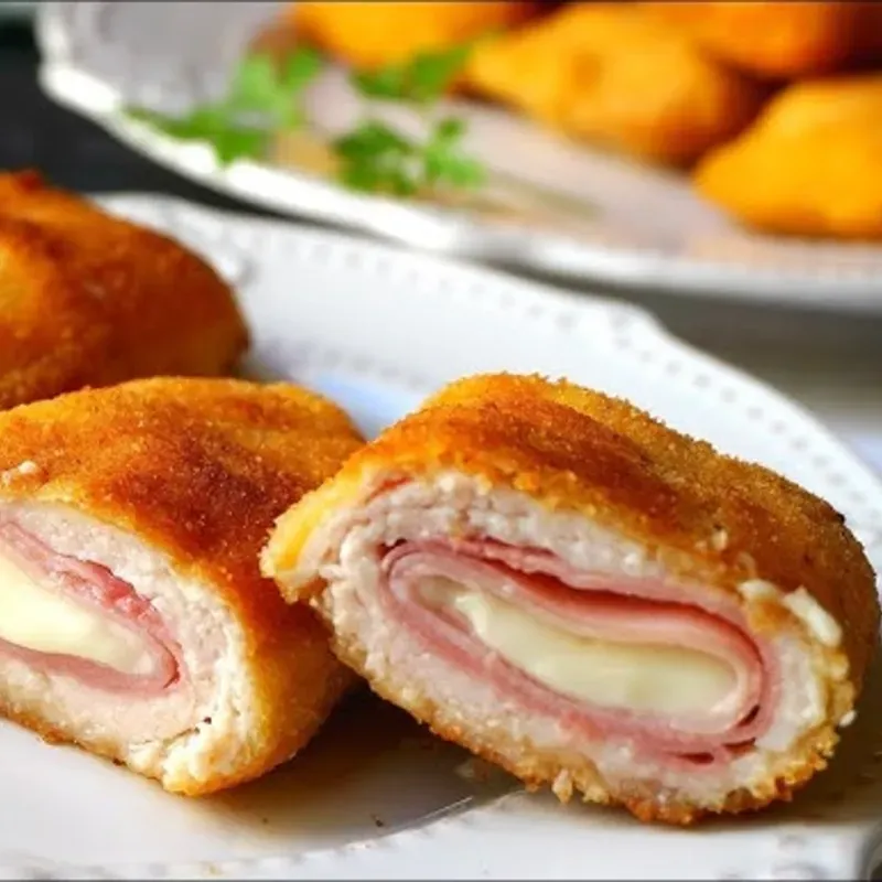 El plato de "Pollo, jamón y queso" se conoce comúnmente como Pollo Cordon Bleu. Consiste en pechugas de pollo rellenas con jamón cocido y queso, empanizadas y cocinadas hasta quedar crujientes y doradas.