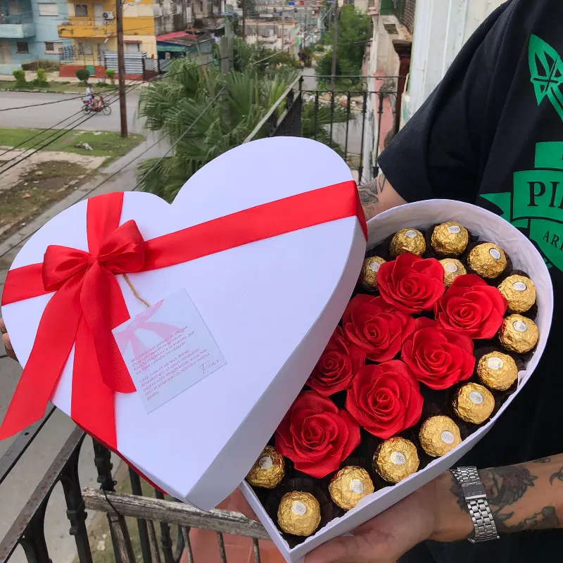 Caja en forma de corazón de doble soporte con 12 rosas de satin, 25-26 bombones Ferrero Rocher, relleno, dedicatoria, fotos estilo polaroids, tapa incluida y lazo.