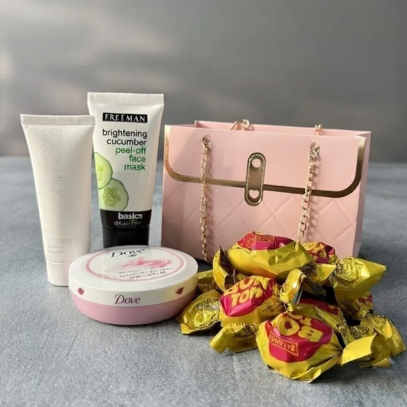 Un delicado bolso rosado con cadena dorada que combina el cuidado personal y un toque dulce. Incluye mascarilla facial, crema corporal, crema nutritiva y deliciosos bombones, creando el regalo perfecto para mimar y sorprender.
